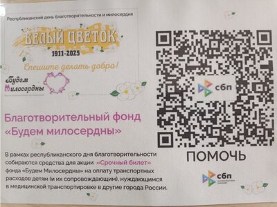 Предлагаем всем неравнодушных поучаствовать в ярмарке «Белый цветок милосердия». В рамках республиканского дня благотворительности собираются средства для акции «Срочный билет» и на строительство первого в России детского хосписа на берегу моря.